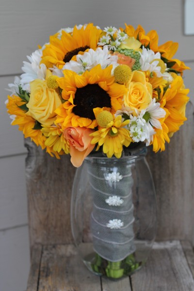 Sunflowers were a must for this wedding. They have always been Ali’s favorite flower so she wanted them everywhere. We coupled those big, cheery flowers with lots of daisies and billy balls and we ended up with a beautiful wedding. I really loved creating these pieces and being a part of this wedding. Congratulations to the lovely couple.