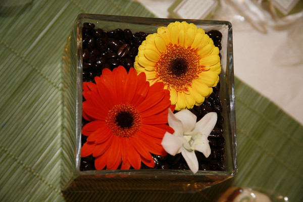 One of their wedding colors was brown, and since you don’t really want brown flowers she had to include that color another way. Karista came up with the idea of using coffee beans in her centerpieces to add the color. We then floated some gerbera daises and dendrobium orchids.